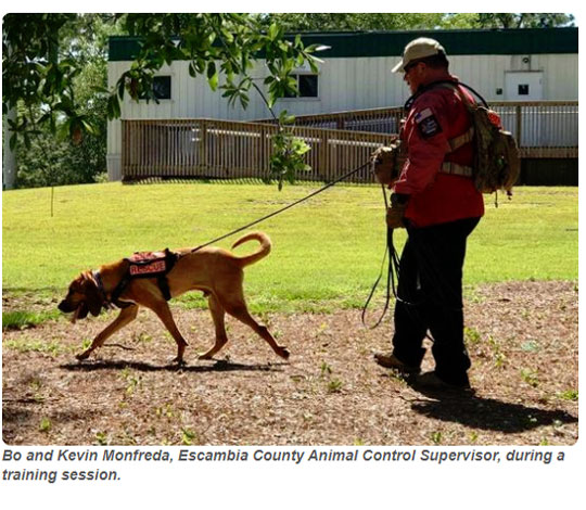 Each Saturday morning, Escambia County Animal Control Supervisor Kevin Monfreda and his 3-year-old bloodhound, Bo, visit campuses and parks along the Gulf Coast. The two aren’t stopping in for a game of fetch or a jog — they’re rigorously perfecting Bo’s skills as a scent trailing dog.