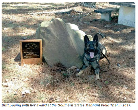 In 2016, Britt competed in the Southern States Manhunt Field Trial and placed fourth in the narcotics search. She returned in 2017 to compete in the same search and came in second place against 17 other dogs.