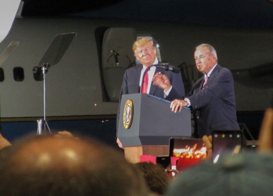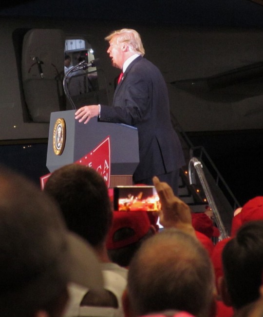 Trump’s speech took place in a new ST Engineering hangar at the Pensacola International Airport with Air Force One just outside the hanger doors. An estimated 3,000 people attended the rally.