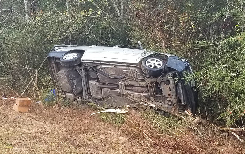 One person was injured in a single vehicle rollover accident Monday afternoon on Highway 29 near Cotton Lake Road. The driver reportedly attempted to avoid a deer, according to witnesses. Escambia County EMS and the Molino, McDavid and Cantonment stations of Escambia Fire Rescue responded, and the Florida Highway Patrol is investigating. Photos for NorthEscambia.com, click to enlarge.