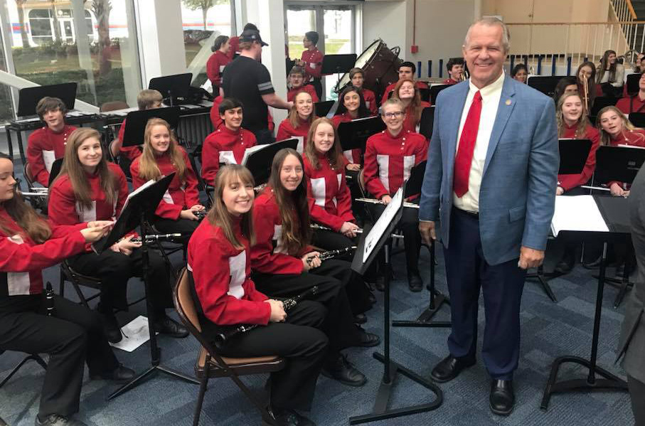 Pictured top: Pearl Harbor survivor Frank Edmond of Cantonment speaks during a Pearl Harbor Remembrance Ceremony Friday at Barrancas National Cemetery. Pictured below: The Tate High School Wind Ensemble perform during a Pearl Harbor ceremony at the Naval Aviation Museum. Pictured bottom: The Tate Wind Ensemble with Florida Sen. Doug Broxson. Photos for NorthEscambia.com, click to enlarge.