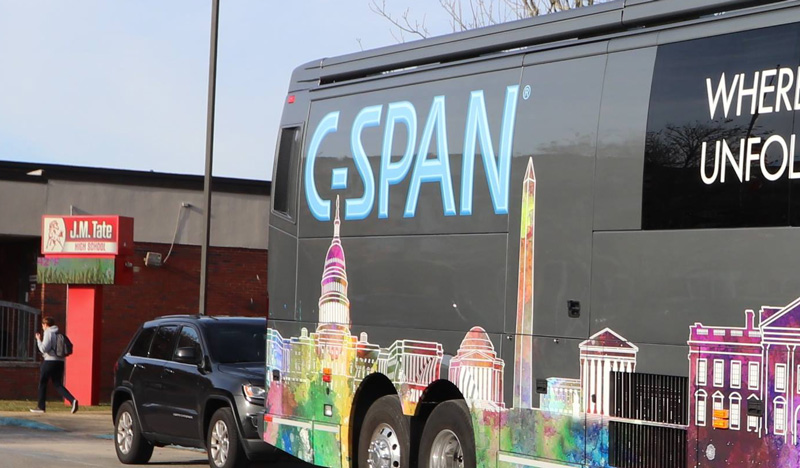 C-SPAN’s state-of-the-art, 45-foot customized motor coach is on a Top Teachers Tour through Florida, South Carolina, Georgia and Tennessee. In partnership with Cox Communications, the C-SPAN Bus stopped at Tate to open its doors to engage students, community members and elected officials through interactive demonstrations of C-SPAN’s multi-platform public service resources.