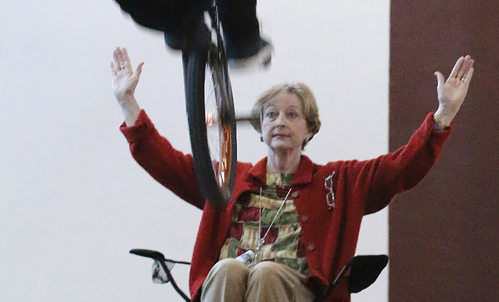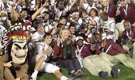 Pictured top: Northview High School Principal Gayle Weaver with the school’s 2012 1A State Championship team in Orlando. Pictured below: Weaver comes face to face with a BMX bicycle jumping over her during a 2016 program at the school. Pictured bottom: Weaver during a recent graduation. NorthEscambia.com photos, click to enlarge.
