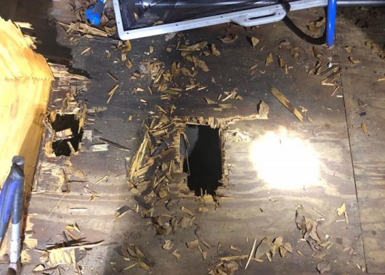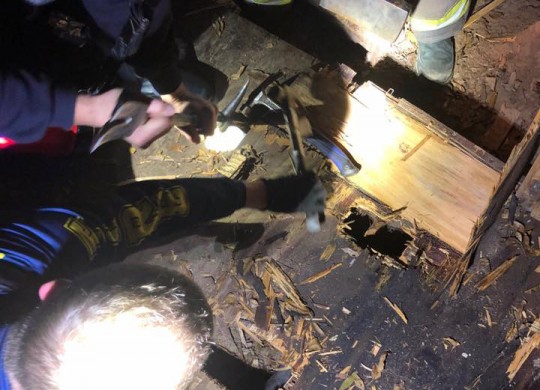 The owners tried their best to get him out, knocking two holes in the plywood before calling Escambia County Fire Rescue for assistance. A crew from the ECFR Ferry Pass Station came to the rescue, prying up the plywood and digging around the dog until he could be freed.