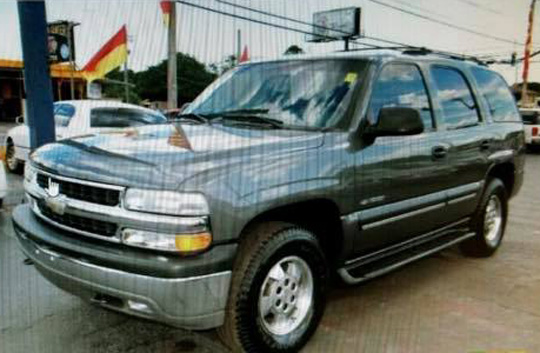 The gray in color 2002 Chevrolet Tahoe with Alabama tag number 30BS443 was taken from the Texaco gas station on Sidney Manning Boulevard at Highway 31. The vehicle has damage to the front left door area and is missing a front bumper.