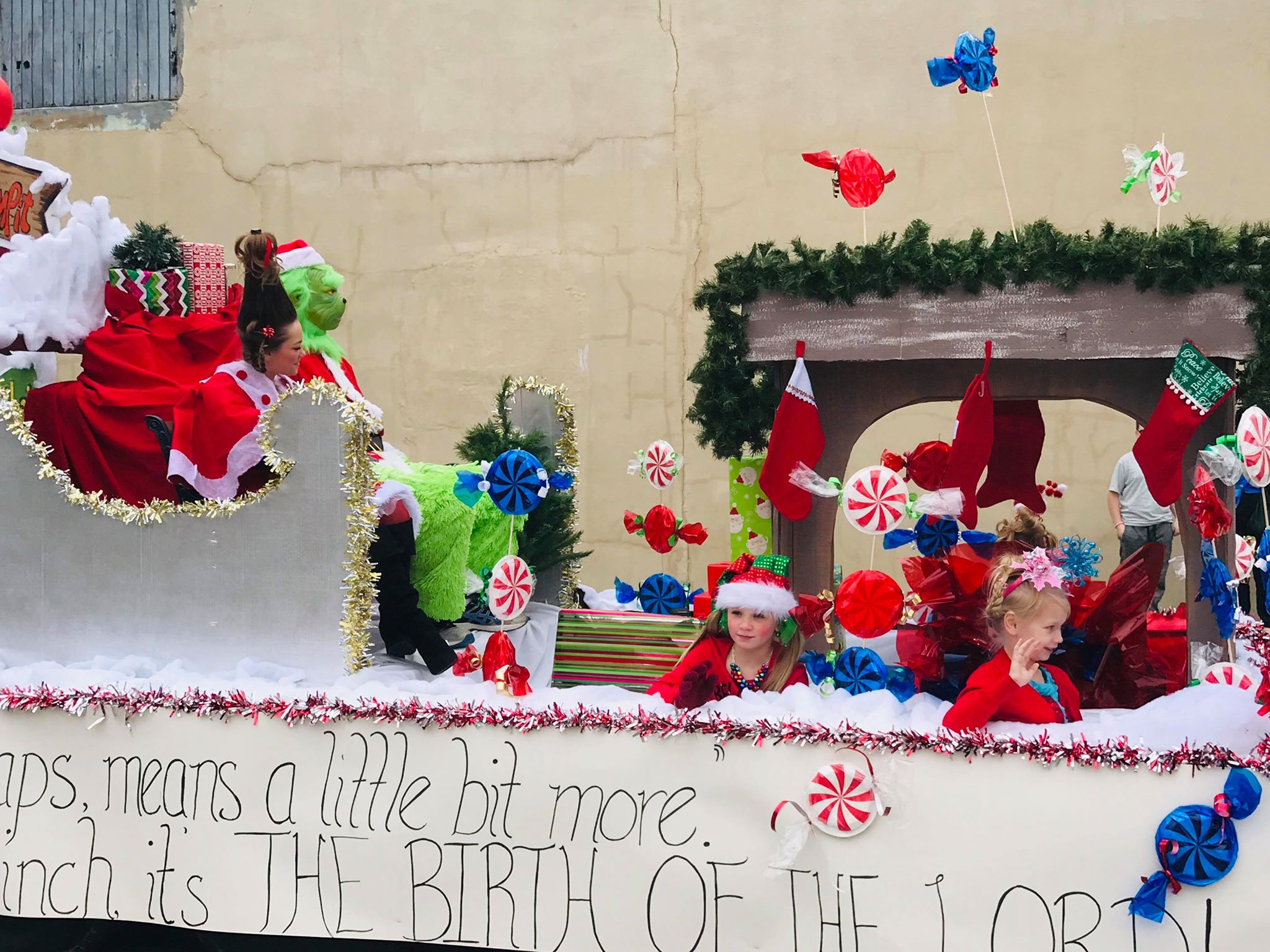 Great job everyone for still doing the parade despite rain reschedules and people turning out to see our state champs. Awesome Grinch and Cindy Lou on the sleigh!