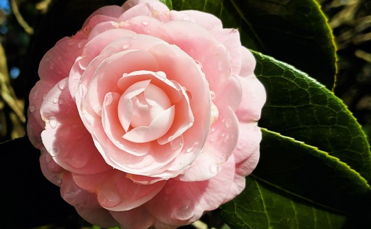 Pictured: Rainfall on a heritage camellia bush Tuesday. NorthEscambia.com photo, click to enlarge.