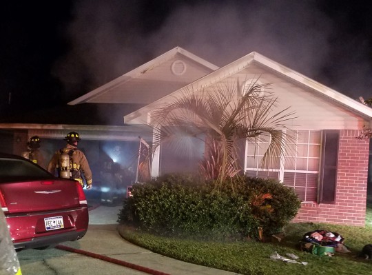 Pictured above: Escambia Fire Rescue Chief Rusty Nail, Lt. Bryan Caro and ECFR Deputy Chief Paul Williams. Pictured below: Caro was honored for pulling a woman from this burning home on Portobella Place last November. Photos for NorthEscambia.com, click to enlarge.