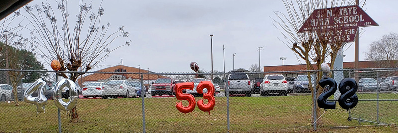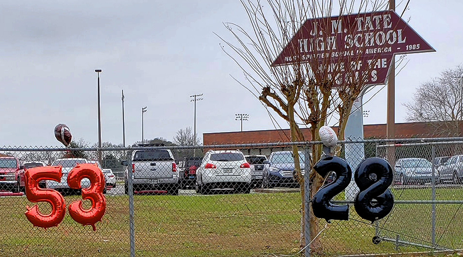 Balloons with the numbers 40, 53 and 28 were on the fence outside Tate High School on Monday. Those were the jersey numbers worn by 15-year old sophomore Sean Banks in basketball, football and baseball.