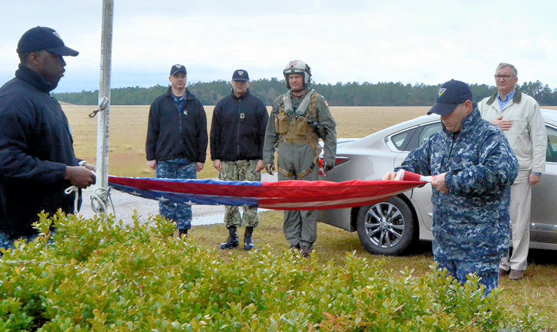 Pictured above: The lowering of the American flag for the last time at OLF 8, and the final flight in and out on Tuesday. Pictured below: The land swap signing between Escambia County and the Navy. Photos for NorthEscambia.com, click to enlarge.