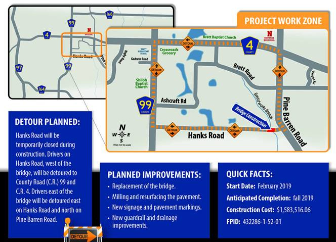 The project also includes new guardrail, drainage improvements, milling and resurfacing, and new signs and pavement markings. Hanks Road will be closed during construction. Drivers west of the bridge will be detoured to Highway 99 and Highway 4. Drivers east of the bridge will be detoured east on Hanks Road to Pine Barren Road. The project is anticipated to be complete in the fall.