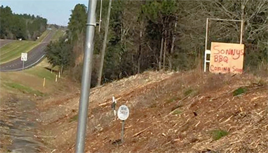 The sign proclaims “Sonny’s BBQ Coming Soon” at Highway 29 and Highway 196. That’s near the Florida Forest Service fire tower, the local home of Smokey.