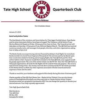 Checks should be made payable to the Tate QB Club, noting “Banks Airline Tickets” in the memo line. Mail checks to: Tate QB Club, P.O. Box 303, Gonzalez, FL 32560.