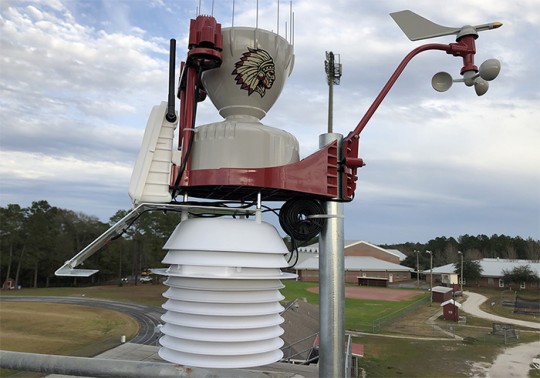 Each WeatherSTEM unit has a variety of sensors that collect data including solar radiation, ultraviolet radiation, amounts and the rate of rainfall, wind speed and wind direction. They are powered by a solar panel and they transmit the data collected to WeatherSTEM where the data can be compiled into a Wet Bulb Globe Temperature which provides guidance to principals, coaches, band directors as well as other instructors and student leaders. Each station includes placement of sensors in two locations, one high and one at field level. The height of the first location also allows a camera to transmit a view of the sky above the school’s field.