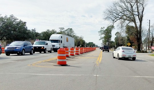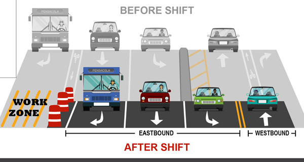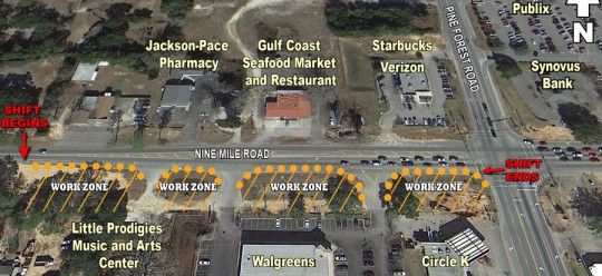 All lanes on Nine Mile Road between Pine Forest Road and the entrance to Walmart will be shifted to the north at 6 a.m. Tuesday, February 12 as workers begin construction of the new eastbound roadway. The temporary shift will remain in effect for several months.