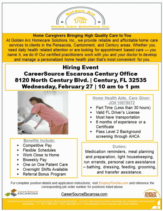 The jobs are with Golden Arc Homecare Services for clients in Century, Cantonment and Pensacola.