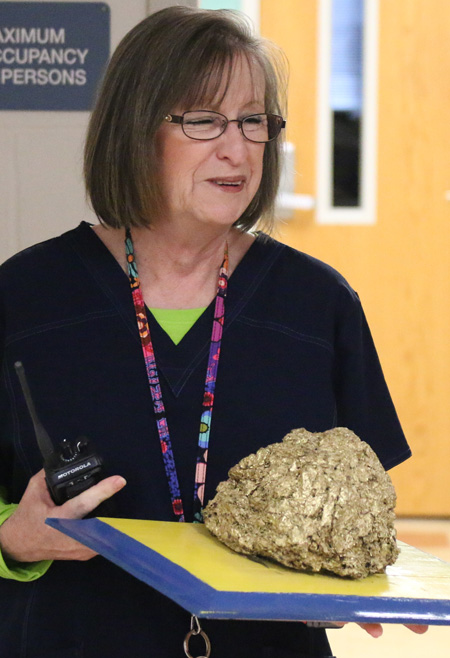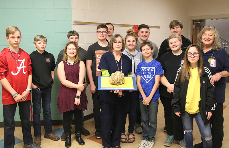 Ernest Ward Middle School nurse Phyllis Malone received the 11th annual “Golden Cow Dung Award” from members of the Ernest Ward FFA Wednesday. The award presented during a FFA appreciation breakfast features a large piece of cow dung, painted a golden color and mounted on a board painted in school colors.