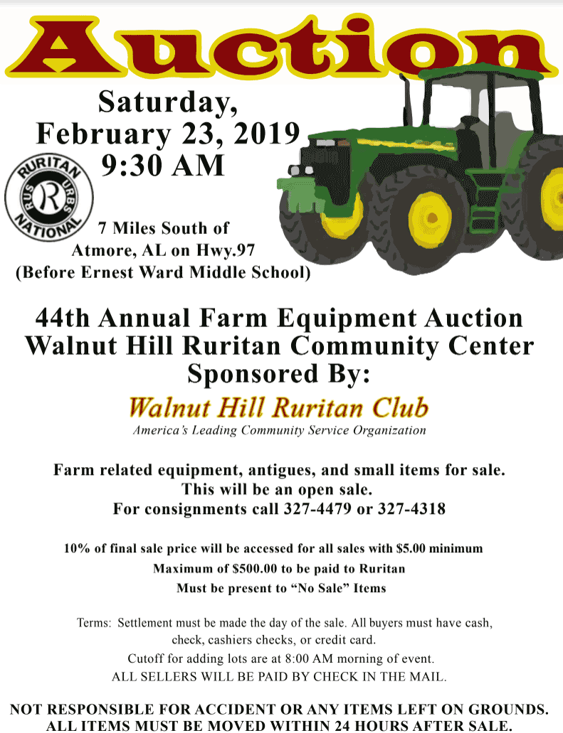 The annual Walnut Hill Ruritan Club Farm Equipment Auction will be held this Saturday, February 23, beginning at 9:30 a.m.