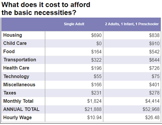 The $26.48 hourly wage is misleading. This equates to $13.24 for each adult. A bit of advice: learn to manage the necessities and save a little each pay period. Diligence and discipline will eventually lead to the buying power to afford items that aren’t a necessity. I drive a 15 year old vehicle, not because I can’t afford a later model but because I’ve set goals and priorities as a means to the end. New phones with unlimited plans, premium cable or satellite programming, new vehicles, dining and entertainment, etc are all items that when listed on a budget can be eye-opening to a family.