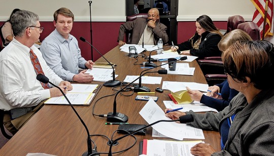 Pictured above: Capital Trust Agency attorney Michael Stebbins (far left) and Denis McKinnon III, CTA senior analyst and compliance officer (second from left), address the Century Town Council. NorthEscambia.com photo, click to enlarge.