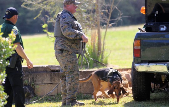 Pictured top: A K-9 from the Century Correctional Institution begins tracking the suspect from a wrecked pickup truck. Pictured below: FWC officers with a shotgun recovered from the pickup. Pictured second below: The pickup barely missed a residence after hitting an old concrete porch. Pictured third below: An FWC officer on the manhunt. Pictured bottom: A FWC officer searches the suspect’s pickup truck. NorthEscambia.com exclusive photos, click to enlarge.