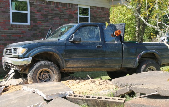 The truck hit a concrete porch that remained after a house was torn down years ago, barely missing an existing residence. A witness said the man, described only as a white male, ran from the truck toward a wooded area. His name has not been released, but we’re told he is wanted on hunting-related charges and additional charges.
