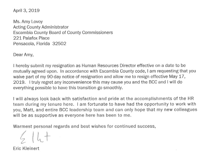 Escambia County Director of Human Resources Eric Kleinert submitted his resignation Wednesday morning.