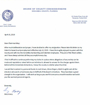 Interim Escambia County Administrator Amy Lovoy has resigned, saying it’s hard to work in an environment filled with “allegations of any variety” that can ruin a person before they can respond. She is the fourth top level administrator to step down from the county this month.