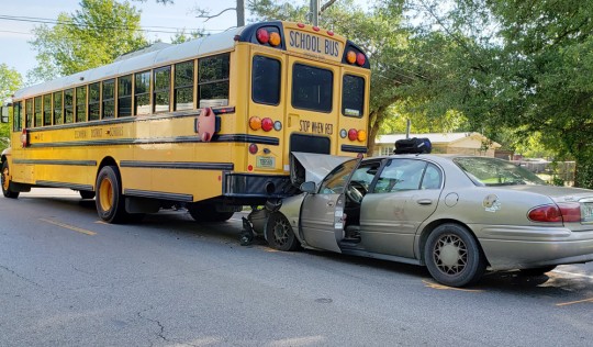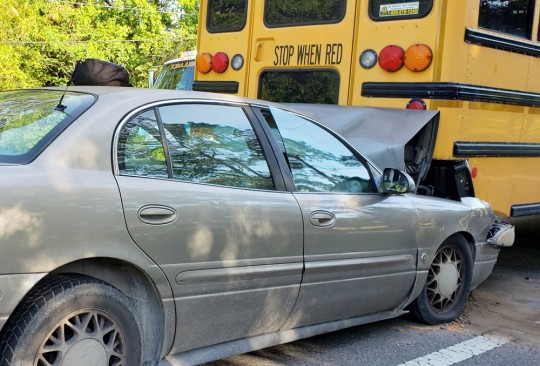 The driver of a passenger car and one student were injured when a school bus was rear-ended Tuesday morning on Pine Forest Road.