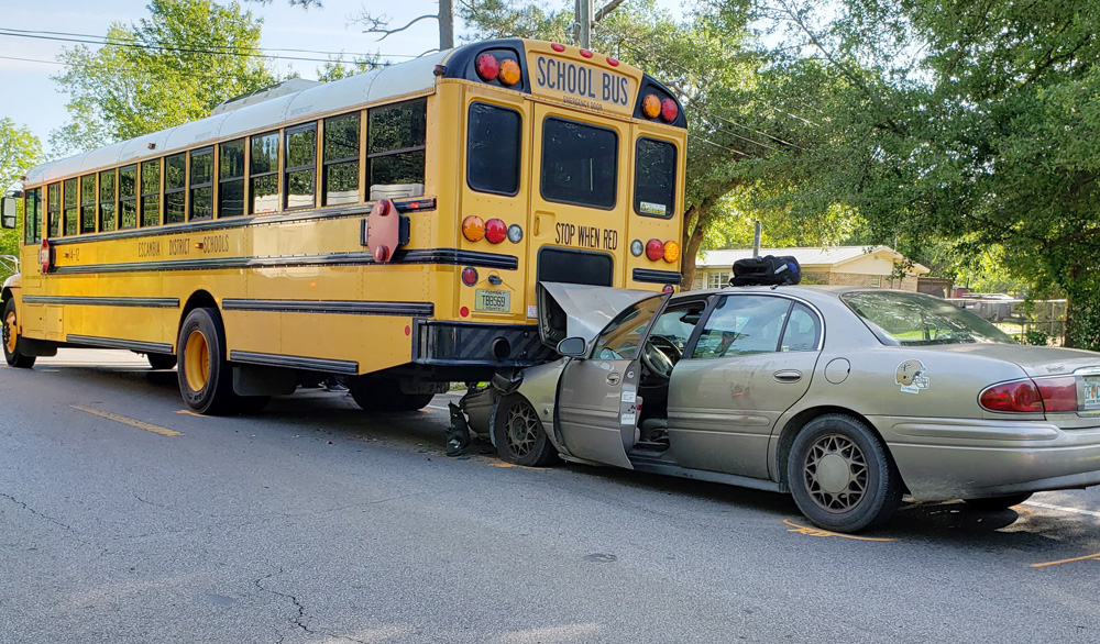 Justin D. Patterson, 29, was northbound on Pine Forest Road just south of West Roberts Road about 7:07 a.m. when he failed to stop and collided with the Escambia County School District bus driven by 59-year old James Edward Roetter, according to the Florida Highway Patrol.