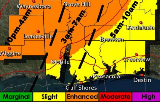 A line of potentially severe storms will move eastward through the area into Sunday morning. The biggest threats will be damaging winds, tornadoes and large hail. The timing on the map above is estimated by the National Weather Service.
