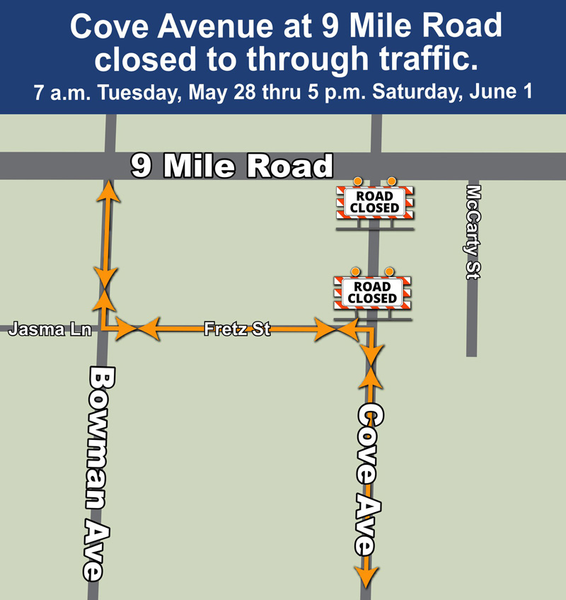 Cove Avenue from Nine Mile Road to Fretz Street will be closed from 7 a.m. Tuesday, May 28 through 5 p.m. Saturday, June 1 to enable crews to perform roadway construction and drainage improvements. Traffic will be detoured to Bowman Avenue and Fretz Street. Detour signs and variable message boards are in place to alert drivers of the temporary road closure and detour routes.