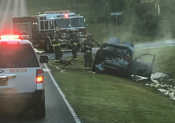 Firefighters battled a vehicle fire Wednesday morning on East Kingsfield Road near Portobella Place. There were no injuries reported. NorthEscambia.com photos by Kristi Barbour and submitted by Kennya Slaughter, click to enlarge