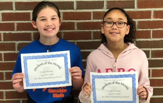 Jim Allen Elementary School has named Students of the Month for April. They are Emily Dunlap (pictured left) and Peyton Lewis. Courtesy photo for NorthEscambia.com, click to enlarge.