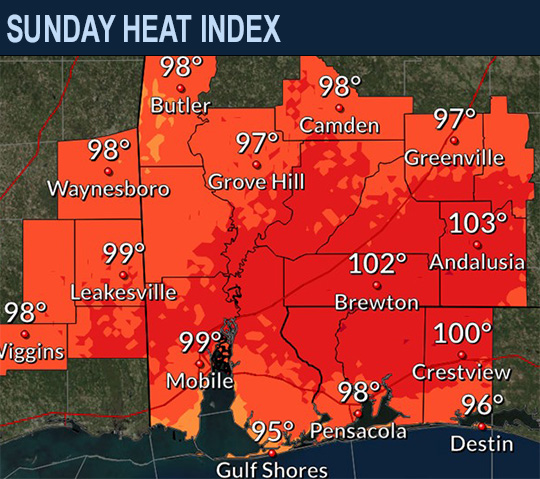 A hot weekend is in store, with heat index values soaring about 100 degrees for inland areas. Here is your official North Escambia area forecast: