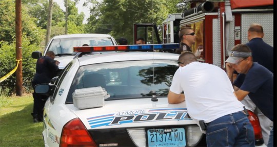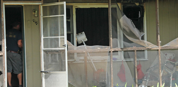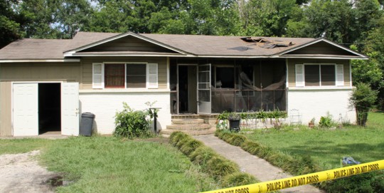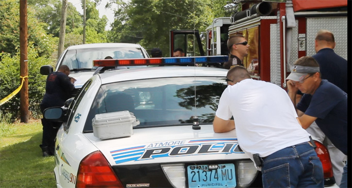 Pictured top and bottom: A woman found dead following a fire at the Adams Street home in June 2013 in Atmore was murdered. Pictured below: Firemen fill out statements for law enforcement following the blaze. NorthEscambia.com photos, click to enlarge.