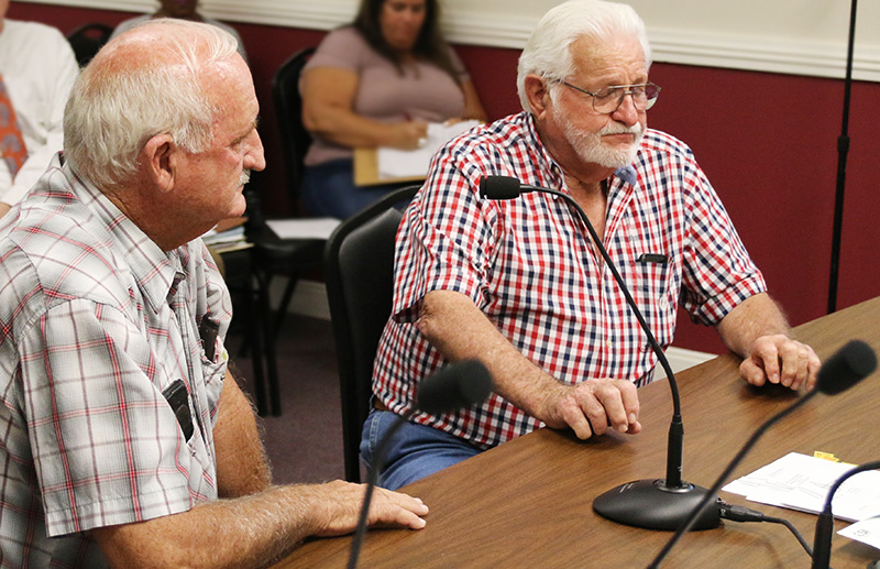 Pictured top Businessman Larry Baxley (left) and West Florida Gin Manager Robert Earl Godwin discuss the Helicopter Technology building (below) with the Century Town Council Monday NorthEscambia.com photos, click to enlarge.