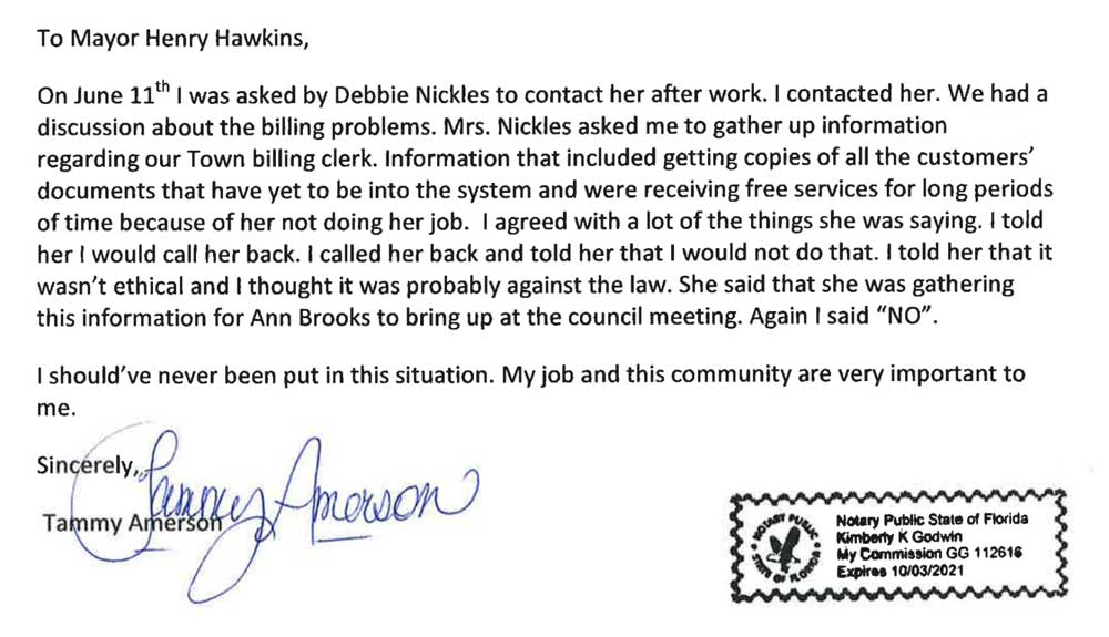 “Mrs. Nickles asked me to gather up information regarding our Town billing clerk,” Amerson stated in the letter. “Information that included getting copies of all the customers’ documents that have yet to be into the system and were receiving free services for long periods of time because of her not doing her job. I agreed with a lot of the things she was saying. I told her I would call her back. I called her back and told her that I would not do that. I told her that it wasn’t ethical and I thought it was probably against the law. She said that she was gathering this information for Ann Brooks to bring up at the council meeting. Again I said ‘NO’.