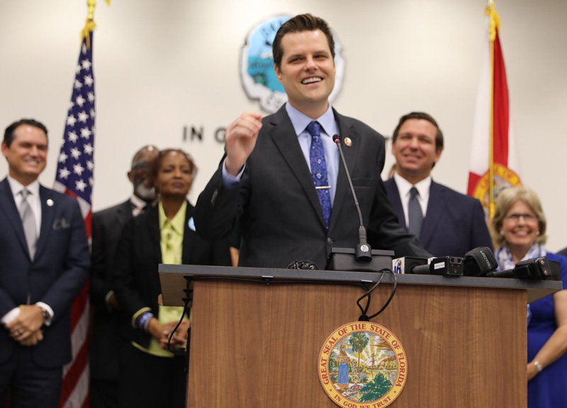 Pictured top: Gov. Ron DeSantis signs a law banning so-called sanctuary cities Friday in Okaloosa County. Pictured below: U.S. Rep. Matt Gaetz speaks in support. Photos for NorthEscambia.com, click to enlarge.