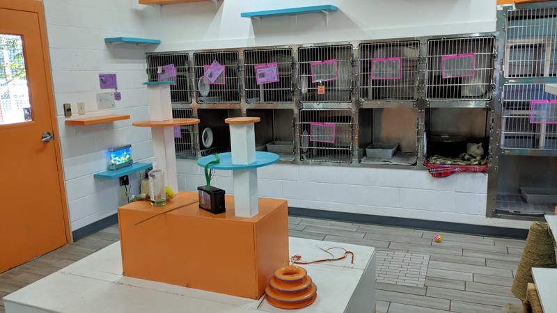 The Catnip Cafe (pictured top) was another room where the kitties had their kennels for private space but were free to roam and play. Behind the bright pink door, there were plenty of toys and lots for a kitty to do. Climbing shelves on the walls, cat towers and even toy fish tanks for entertainment. There was also an enclosed outdoor patio for the outdoor types. Again, it was all bright, clean and free of odors.