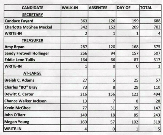 Charlotte Meckel won the secretary position with 703 vote to 688 for Candace Fayard.