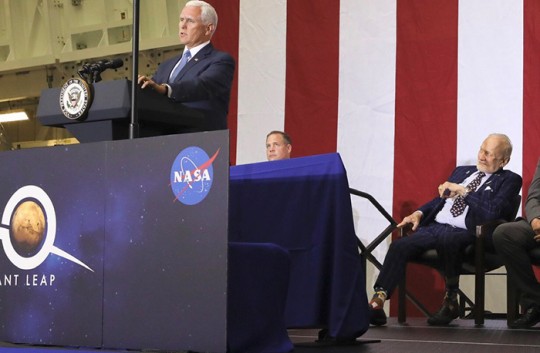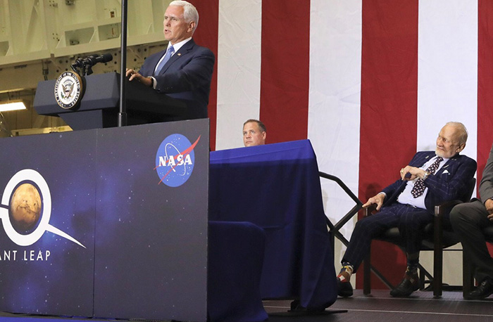 The governor and vice President were joined by former astronaut Buzz Aldrin, Kennedy Space Center Director Robert Cabana, Lockheed Martin CEO Marillyn Hewson, NASA Administrator Jim Bridenstine and distinguished members of Congress.