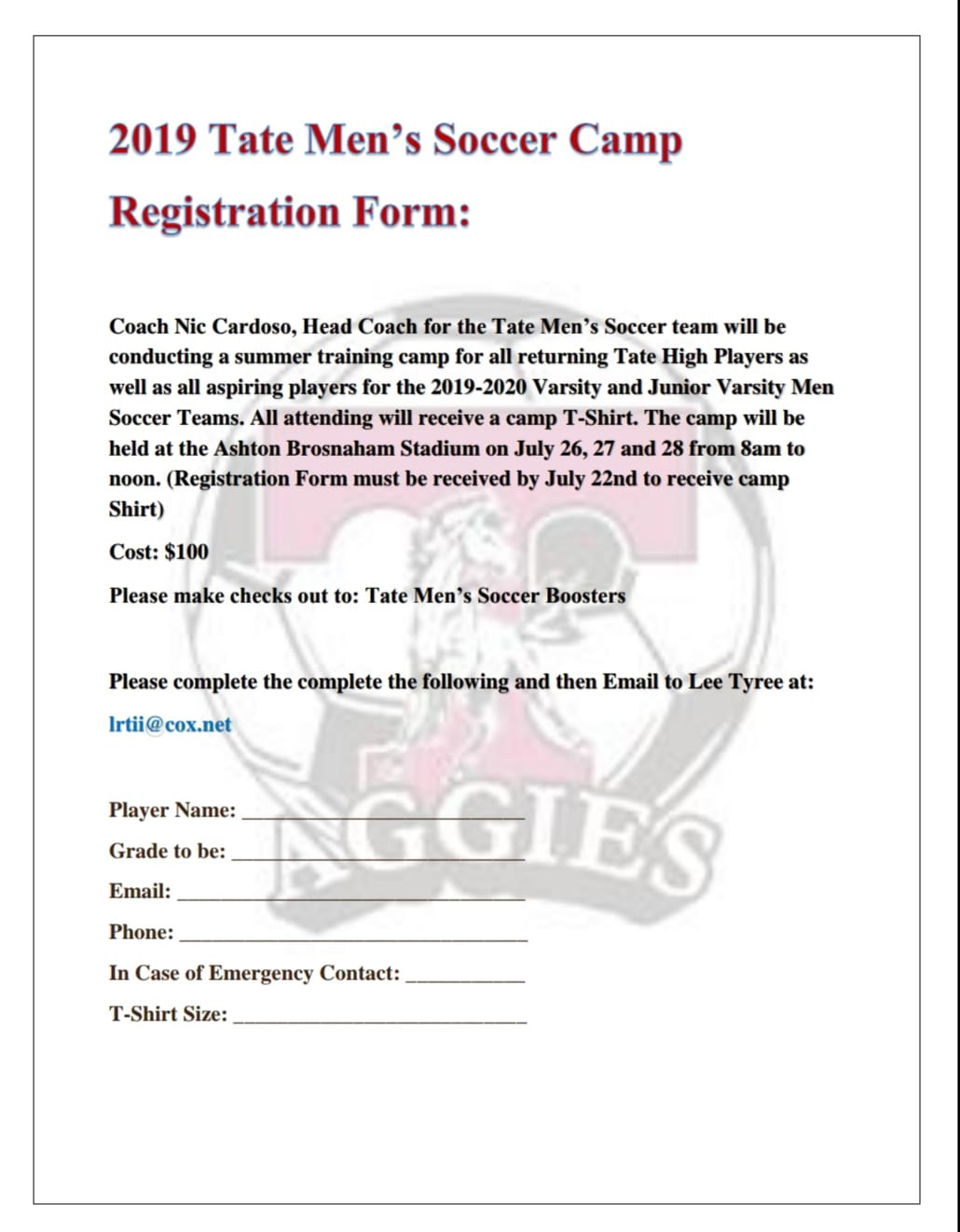 Monday is the deadline to register for the 2019 Tate High School Men’s Soccer Camp in order to receive a camp t-shirt.