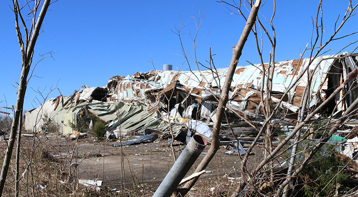 The 38-acre abandoned industrial site was heavily damaged and, until recently, sat mostly untouched since 150 mph tornado winds the afternoon of February 15, 2016.