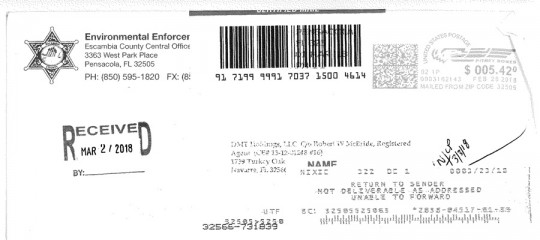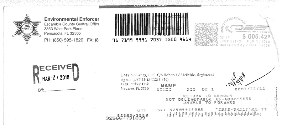 The property owner — listed in county records as DMT Holdings LLC in Navarre –was cited years ago by Escambia County Code Enforcement. The limited liability company appeared to be dissolved in 2008. Back property taxes for 2015-2017 were paid through tax certificate sales, not by the holding company.
