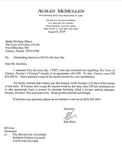 According to a invoice provided by Tallahassee attorney Ausley McMullen on behalf of City Services, the town was last current in August 2018 and then fell behind, making two payments on four month’s billings. The town last made a payment on December 31, 2018, leaving a balance of $3,638.27.