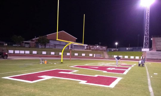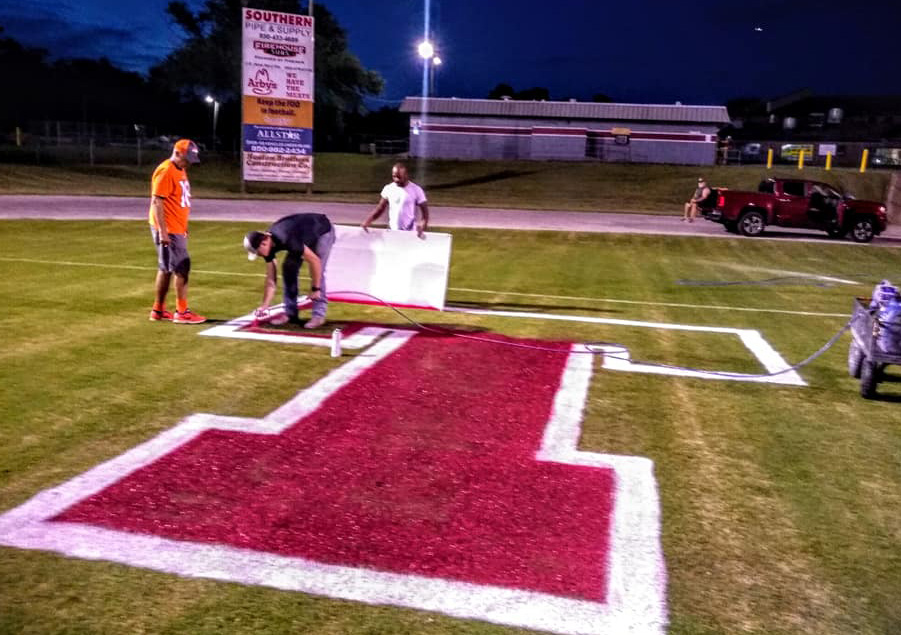 Volunteers were under the lights Thursday night in Tate High School’s Pete Gindl Stadium painting the field in preparation for the Aggie’s season opener Friday night.