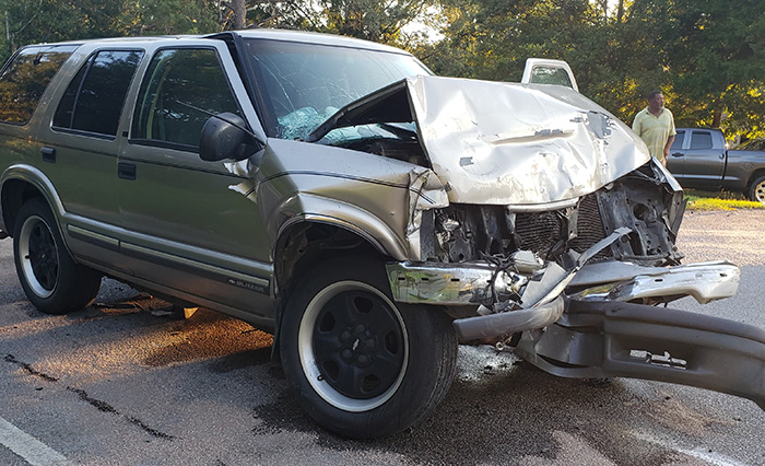 The driver of Chevrolet Blazer was injured when she rear-ended a Ford pickup truck about 6:25 p.m. She was transported to an area hospital by Escambia County EMS with injuries that were not considered life threatening.