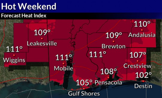 Temperatures will top out in the mid to upper 90s this weekend with the heat index soaring to 107-112, possibly as high as 115 degrees. Temperatures are forecast to only fall into the upper 70s at night, so there will not be much relief from the heat.