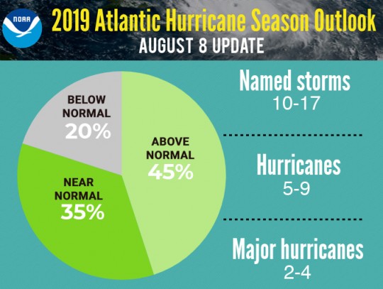Seasonal forecasters with NOAA’s Climate Prediction Center have increased the likelihood of an above-normal Atlantic hurricane season to 45% (up from 30% from the outlook issued in May). The likelihood of near-normal activity is now at 35%, and the chance of below-normal activity has dropped to 20%.